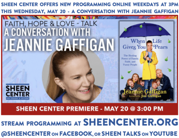 Producer, television writer and author Jeannie Gaffigan joins The Sheen Center’s David DiCerto for a conversation about the importance of faith, family and laughter in getting us through these difficult times. She will also share how her own life-threatening health scare has given her a new perspective on the redemptive power of suffering, recounted in her latest book, When Life Gives You Pears: The Healing Power of Family, Faith and Funny People.