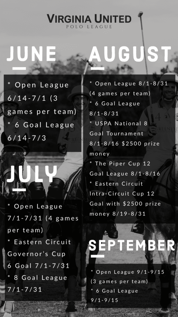 Summer Polo Schedule – Virginia United by Chuck Gregory | Jun 4, 2020 | Events Virginia United Polo was created to unify polo in Va with fields at Kingland, Foxlease and Beverly. For more information click here Author: Chuck Gregory