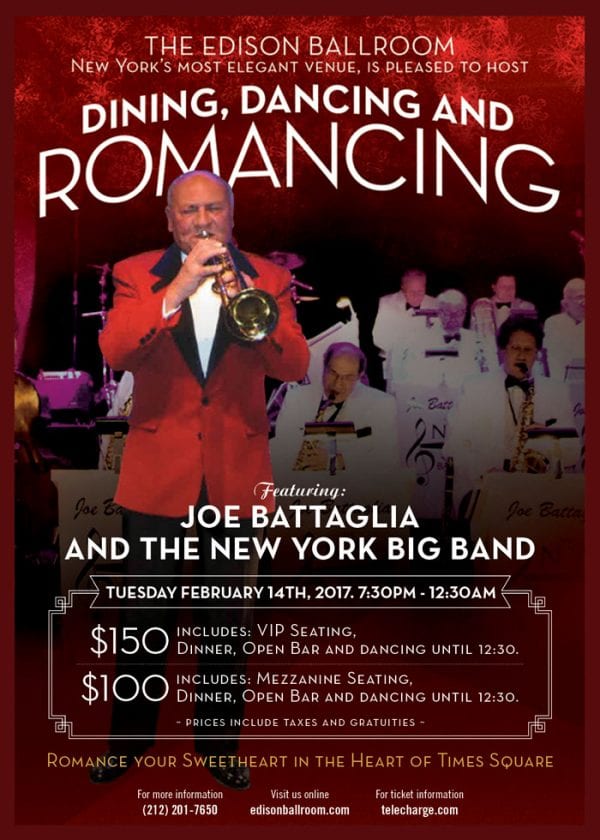 If you like a glamorous Rainbow Room-type supper club evening, with ballroom dancing and a romantic Valentine’s Day vibe, the Joe Battaglia and The New York Big Band event at The Edison Ballroom delivers. The evening includes an all-night-long open bar, 4-course dinner and 4 hours of dancing to the live music of Joe Battaglia’s Big Band sound (with Direct Latin Influence, also known as DLI, playing during their breaks).
